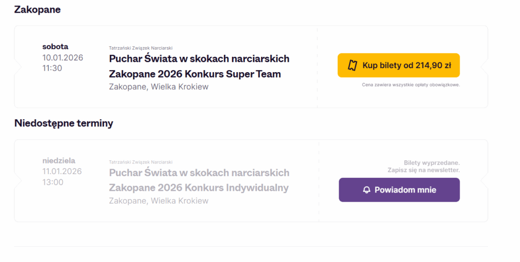 Jak się okazuje, ostatni skok w Zakopanem Stoch odda prawdopodobnie przy pełnej publice. W systemie ebilet.pl nie ma już biletów na niedzielny konkurs (stan na sobotę 10.01 na godzinę 8.15). Choć jeszcze nie ma oficjalnego komunikatu o sold oucie, należy się go spodziewać.