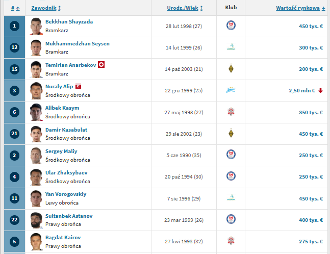 Reprezentacja Kazachstanu nie jest drużyną “naszpikowaną” gwiazdami. Z pewnością jedną z najważniejszych postaci nowego zespołu Probierza jest kapitan zespołu Nuraly Alip. 25-latek na co dzień gra w Zenicie, a w przeszłości występował też choćby w Kairacie Ałmaty. Ma na koncie kilka trofeów, a jego wartość rynkowa wyceniana jest na 2,5 miliona euro.
