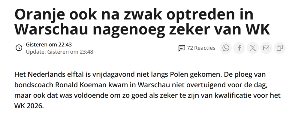 – Reprezentacja Holandii nie zdołała pokonać Polski w piątkowy wieczór. Zespół selekcjonera Ronalda Koemana nie zaprezentował się przekonująco w Warszawie, ale to wystarczyło, by praktycznie zagwarantować sobie awans do mistrzostw świata 2026 – dodaje źródło.