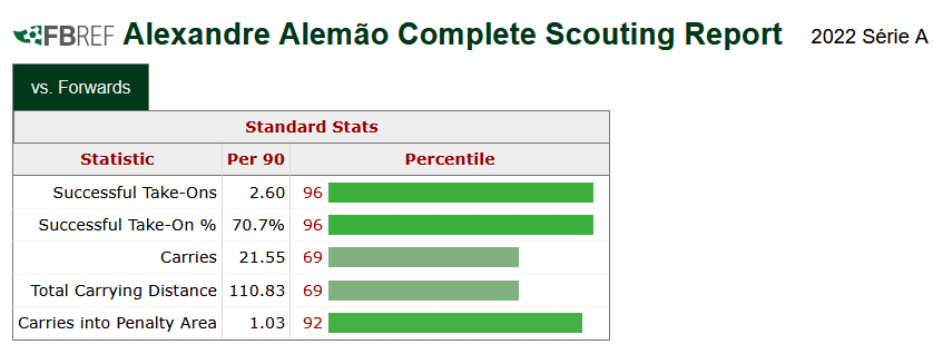 Choć może to nie być tak oczywiste, jako że mówimy o nominalnej dziewiątce, to ma on także bardzo przyzwoitą technikę prowadzenia futbolówki. W sezonie 2022 w brazylijskiej ekstraklasie był absolutną czołówką na swojej pozycji pod względem udanych dryblingów (2.60 na mecz), jak i ich skuteczności (aż 70.7%). Nie jest typowym koczownikiem i potrafi sam sobie wykreować okazję, o czym świadczyła również statystyka jego wejść z piłką w pole karne rywala (1.03 na mecz).