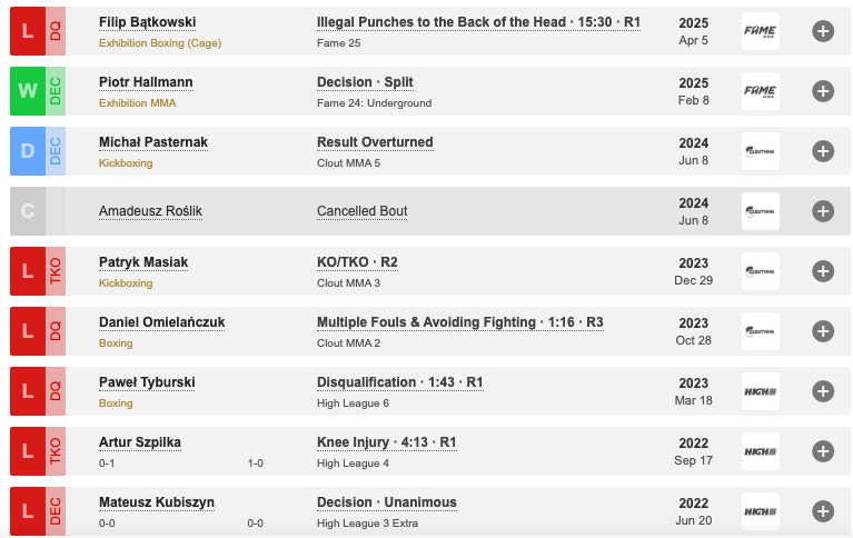 Wystarczy przypomnieć jego przegrane walki z Arturem Szpilką czy Pawłem Tyburskim, gdy szybko się poddawał, a kibice oskarżali go o symulowanie kontuzji. Natomiast w starciu z Danielem Omielańczukiem uciekł z klatki, a w pojedynku z “Wielkim Bu” padał na matę, gdy jego rywal tylko tupnął…