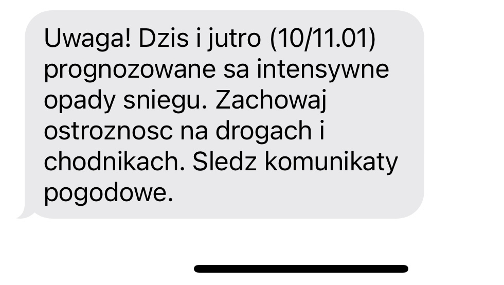 – Uwaga! Dziś i jutro (10/11.01) prognozowane są intensywne opady śniegu. Zachowaj ostrożność na drogach i chodnikach. Śledź komunikaty pogodowe – napisano w wiadomościach.