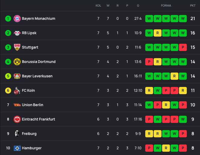 Po siedmiu kolejkach Bundesligi Bayern ma komplet punktów (21) i jest liderem. Borussia zajmuje czwarte miejsce (14 pkt), ostatnie dające grę w Lidze Mistrzów. W następnej serii gier Bawarczycy zagrają z Borussia Moenchengladbach, a BVB zmierzy się z FC Koeln, gdzie występuje Jakub Kamiński.