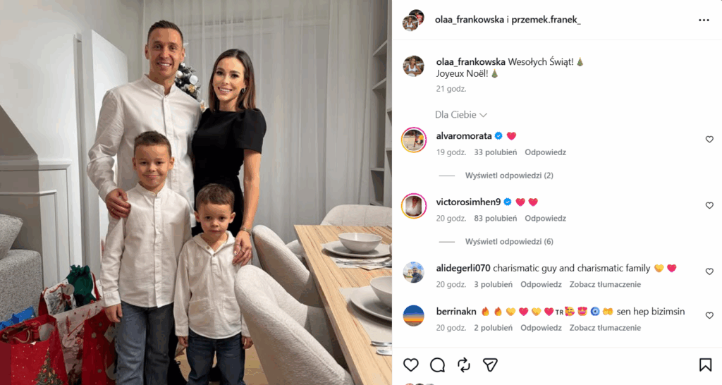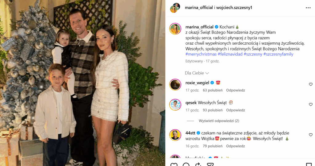 Boże Narodzenie jest czasem dla rodziny oraz chwilą na odpoczynek także od sportowych wyzwań i emocji. Sportowcy chętnie chwalą się w swoich mediach społecznościowych tym, jak spędzają tegoroczne święta. Wojciech Szczęsny wraz z żoną Mariną i dziećmi złożyli kibicom życzenia i pochwalili się zdjęciem rodzinnym z choinką.