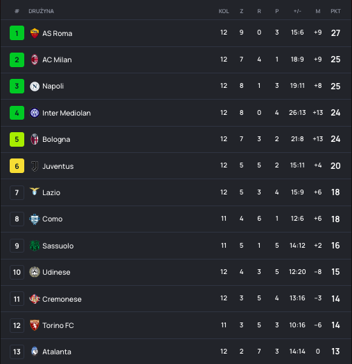 Dzięki wygranej Milan ma 25 punktów po 12 kolejkach i traci tylko dwa „oczka” do Romy, która jest liderem. Podium uzupełnia Napoli, które broni trofeum, a Inter jest czwarty (24 pkt).