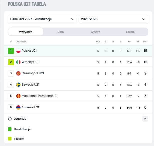 Biało-Czerwoni są aktualnie liderami tabeli z kompletem 15 punktów. Do rozegrania jest jeszcze pięć spotkań. Przypomnijmy, że gra toczy się o awans na mistrzostwa Europy, które odbędą się w 2027 roku w Albanii i Serbii. Kwalifikacje potrwają w sumie do października 2026. Przepustkę na turniej zgarnie tylko zwycięzca grupy. Druga drużyna będzie musiała natomiast uczestniczyć w barażach.