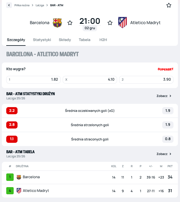 FC Barcelona zagra z Atletico Madyt w hitowym starciu LaLiga. W ostatnich pięciu spotkaniach ligowych Barcelona odniosła aż cztery zwycięstwa. Blaugrana wykorzystała potknięcia Realu i wskoczyła na fotel lidera La Ligi. Aktualnie ma punkt przewagi nad Królewskimi. We wtorek zespół Hansiego Flicka zrobi wszystko, aby kontynuować dobrą passę.