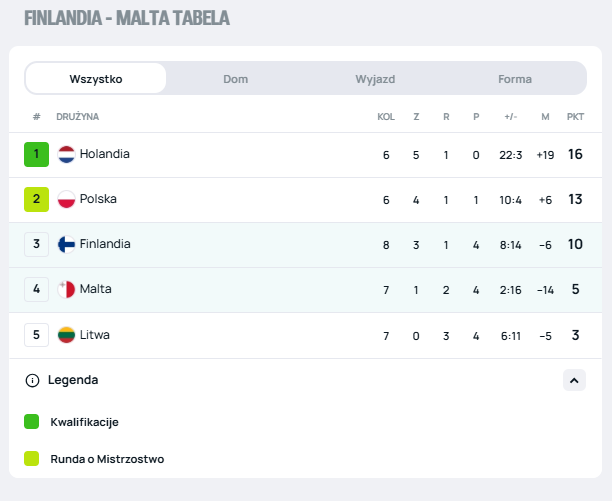 Tym samym Finowie nie powiększyli swojego dorobku punktowego, co jest bardzo dobrą wiadomością dla Polaków. Przed meczem z Holandią nasz zespół wciąż ma trzy punkty przewagi nad Finlandią, a w piątek wieczór przewaga może wzrosnąć do czterech lub sześciu punktów w zależności od wyniku! Jedno jest pewne – Polska na pewno skończy eliminacje na co najmniej drugim miejscu i zagra w barażach. Finowie nie mają już żadnego meczu do rozegrania!
