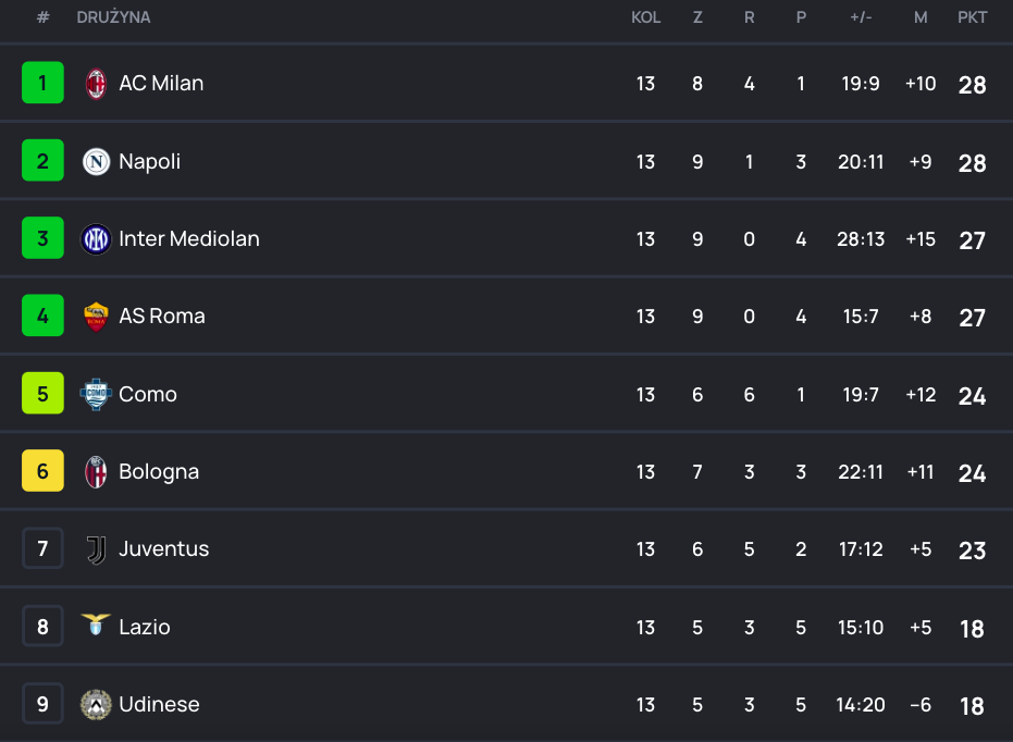 Po 13 kolejkach Serie A Inter jest trzeci i ma 27 punktów, czyli o jeden mniej niż AC Milan oraz Napoli. W Lidze Mistrzów Interowi też przyzwoicie idzie. Zdobył 12 na 15 możliwych punktów i jest czwarty w tabeli. W następnej kolejce Serie A Inter zagra z Como, a potem w LM podejmie Liverpool.