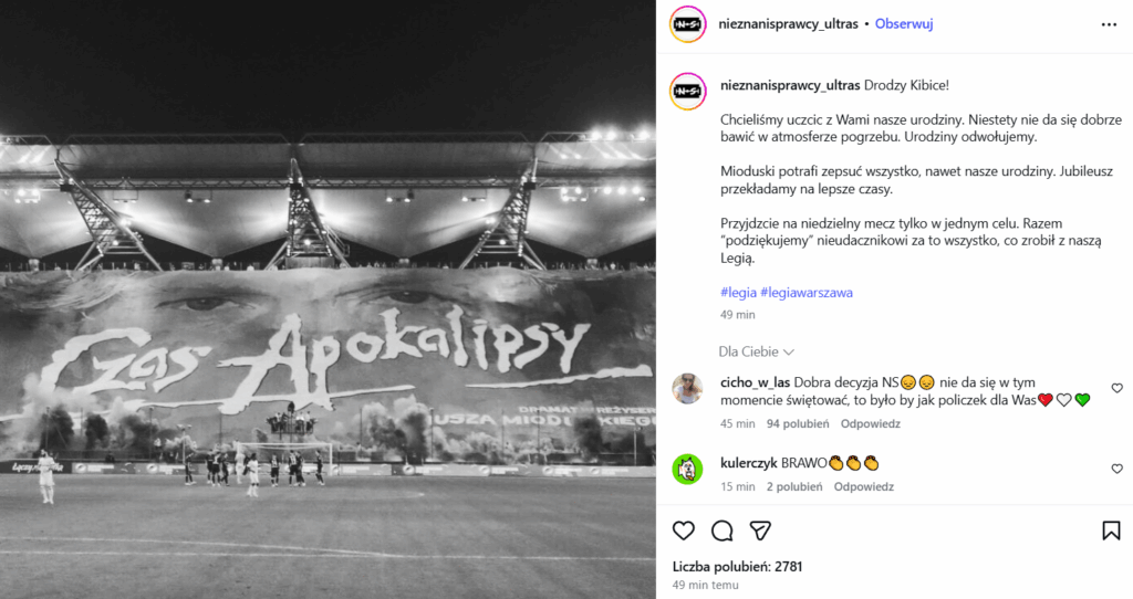 – Drodzy Kibice! Chcieliśmy uczcić z Wami nasze urodziny. Niestety nie da się dobrze bawić w atmosferze pogrzebu. Urodziny odwołujemy. Mioduski potrafi zepsuć wszystko, nawet nasze urodziny. Jubileusz przekładamy na lepsze czasy. Przyjdźcie na niedzielny mecz tylko w jednym celu. Razem “podziękujemy” nieudacznikowi za to wszystko, co zrobił z naszą Legią – napisali kibice za pośrednictwem Instagrama.