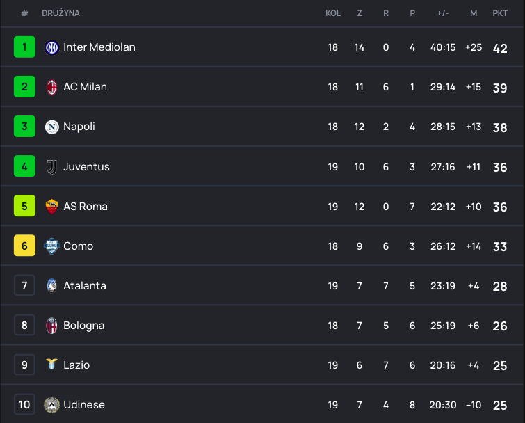 Cała tabela Serie A na „SuperScore”