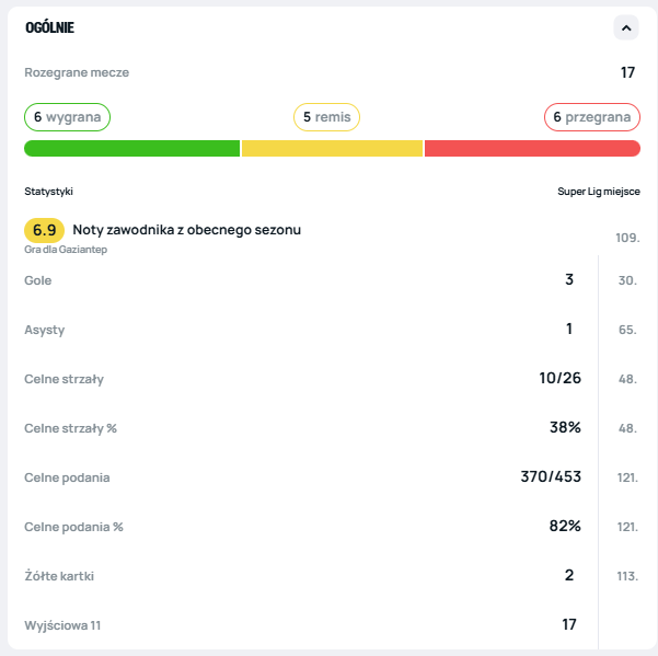 Kacper Kozłowski jest ważną postacią Gaziantepu w bieżącym sezonie. Jak dotąd wystąpił w 18 spotkaniach we wszystkich rozgrywkach, a jego bilans to trzy gole i jedna asysta. Najczęściej gra na prawym skrzydle, ale trener korzysta z niego również w środku pola.