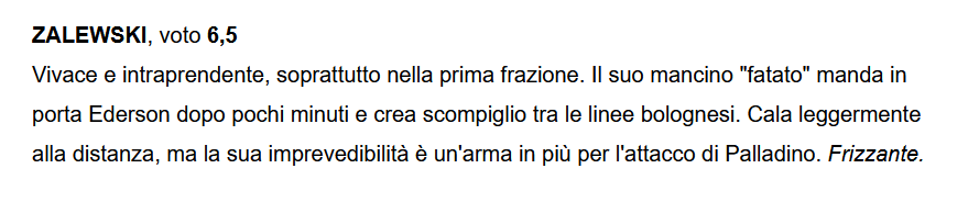 – Znów zagrał on, a nie Samardzić czy Pasalić. Niewiele brakowało, by jego „czarodziejska” lewa noga wyczarowała magiczną asystę dla Edersona. Dobrze pracuje z przodu, ale czasami gaśnie – czytamy na „Tuttomercato”, które podkreśliło znaczenie lewej nogi Nicoli Zalewskiego.