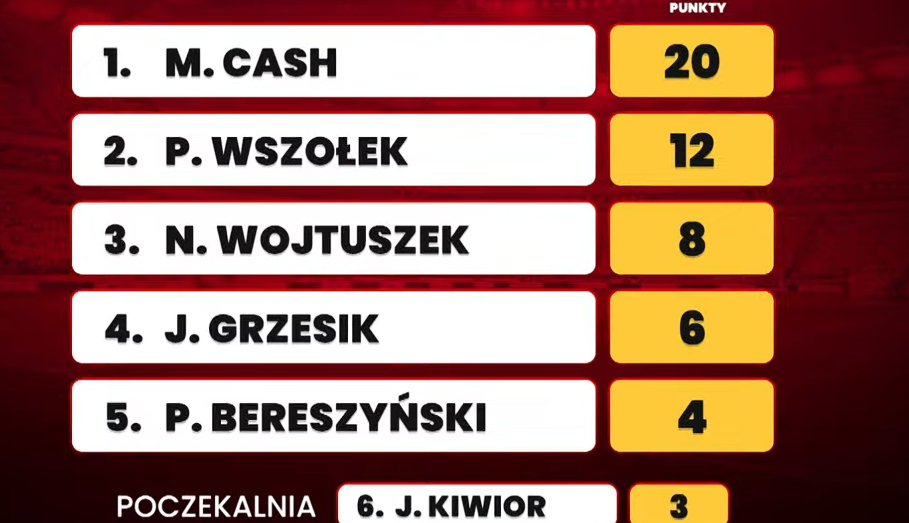 Cash w naszym zestawieniu (po podliczeniu głosów) wyprzedził Pawła Wszołka oraz Norberta Wojtuszka. Zawodnik Jagiellonii typowany jest w kontekście gry w reprezentacji Polski. Podobnie jak Jan Grzesik, który ma za sobą świetną rundę w Radomiaku. Piąte miejsce zajął Bartosz Bereszyński, który otrzymał punkty od Artura Wichniarka.