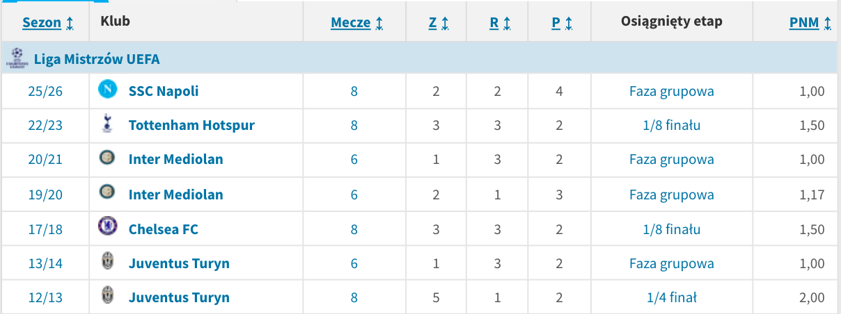 Napoli to jedyny włoski zespół, który już się pożegnał z LM – Atalanta, Juventus i Inter grają dalej. Ostatnim obrońcą scudetto, który nie dostał się do fazy pucharowej był Juventus w sezonie 2013/14. Tamten Juventus i obecne Napoli łączy postać trenera – Antonio Conte.