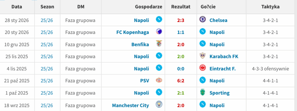 Napoli przegrało z Chelsea 2:3 i zakończyło fazę ligową na zawstydzającym 30. miejscu. Po ośmiu kolejkach miało na koncie raptem osiem punktów i koszmarny bilans bramkowy (9:15). Wyżej w tabeli skończyły m.in.: Royale Union SG, Pafos, Bodo/Glimt, Karabach Agdam czy Club Brugge.
