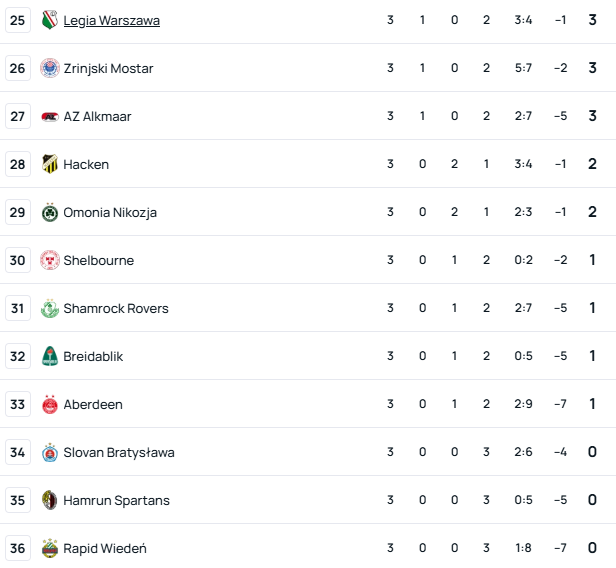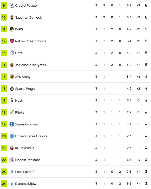 Tabela nie pozostawia złudzeń: w czołowej ósemce fazy ligowej nie ma obecnie żadnej polskiej drużyny. Najlepiej spisuje się Raków Częstochowa, który zajmuje obecnie 12. miejsce w tabeli. Na ten moment awans do fazy pucharowej mogłaby zapewnić sobie także Jagiellonia Białystok (14.) oraz Lech Poznań (23.). W najgorszej sytuacji jest Legia Warszawa. Stołecznemu klubowi grozi pożegnanie z rozgrywkami. Po porażce z Celje podopieczni Inakiego Astiza spadli na 25. lokatę.