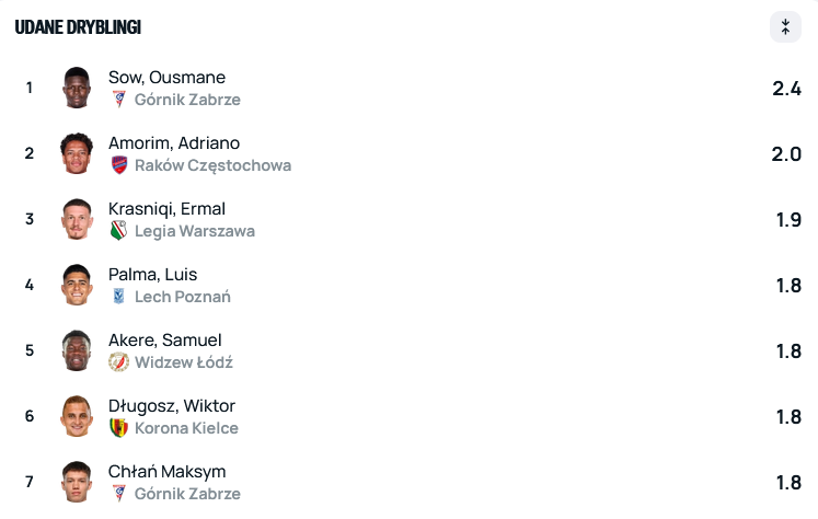 Jego liczby są imponujące: mówimy o siedmiu strzelonych golach i trzech zanotowanych asystach w szesnastu spotkaniach. A jego wkład w grę drużyny na bramkach i asystach się nie kończy. Wystarczy powiedzieć, że Sow jest najlepszym dryblerem tego sezonu Ekstraklasy – notuje średnio 2,4 udanego dryblingu na mecz. Wyprzedza pod tym względem wszystkich piłkarzy: w tym Amorima z Rakowa, Krasiniqego z Legii, Palmę z Lecha, czy Akere z Widzewa. Z Górnika drugim zawodnikiem pod tym względem jest Maksym Chłań (1,8 udanego dryblingu na mecz).