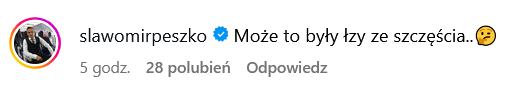 Słowa Przemysława Cecherza spotkały się z mocną ripostą ze strony Sławomira Peszki, który obecnie pełni funkcję wiceprezesa do spraw sportowych w krakowskim klubie. — Może to były łzy ze szczęścia – napisał 40-latek w komentarzu na Instagramie. — W pewnych sytuacjach prawdziwy mężczyzna powinien milczeć, Sławku – odpisał jeden z użytkowników, co spotkało się z kolejną odpowiedzią Peszki. — Oglądając ten program – zgadzam się – zwieńczył członek zarządu Wieczystej.