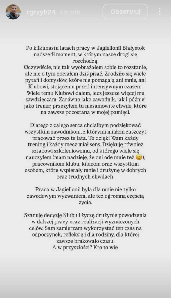 – Szanuję decyzję Klubu i życzę drużynie powodzenia w dalszej pracy oraz realizacji wyznaczonych celów. Sam zamierzam wykorzystać ten czas na odpoczynek, refleksję i dla rodziny, dla której zawsze brakowało czasu. A w przyszłości? Kto to wie – zakończył Rafał Grzyb.