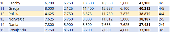 Zadowoleni mogą być też Czesi, którzy zajmują 10. miejsce. Choć Sparta straciła punkty w meczu z Rakowem, Sigma Ołomuniec okazała się lepsza od Noah w Lidze Konferencji. Jeśli chodzi o Ligę Europy, Viktoria Pilzno zremisowała z Fenerbahce. Obecnie nasi sąsiedzi mają na swoim koncie 43,100 pkt.