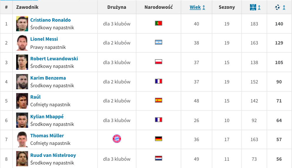 Ale to nie jedyna statystyka, w którą aż trudno uwierzyć. Haalanda dzieli już tylko jedno trafienie od legendarnego Ruuda van Nistelrooya, który na początku wieku hurtowo strzelał dla Manchesteru United i Realu Madryt. Holender w klasyfikacji wszech czasów strzelców LM zajmuje ósme miejsce. Biorąc pod uwagę, że 37-letni Robert Lewandowski w tym sezonie jeszcze nie strzelił gola w LM, trudno się spodziewać, by Polak, autor 105 goli w LM, kiedykolwiek dogonił Leo Messiego (129) i Cristiano Ronaldo (140). W takim razie dziś tylko Mbappe i Haaland mogą marzyć o ściganiu dwóch legend.