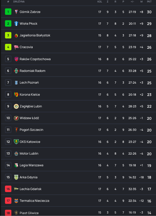 Tabelę Ekstraklasy dostarcza „SuperScore„
