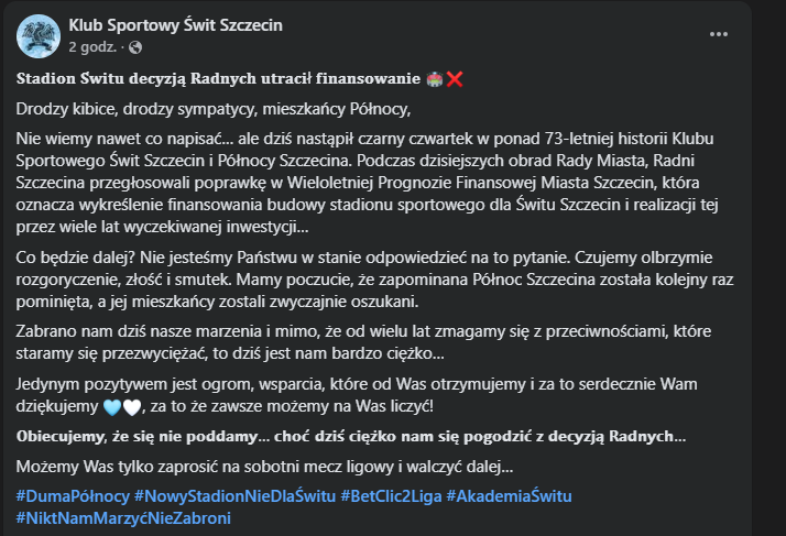 – 𝐒𝐭𝐚𝐝𝐢𝐨𝐧 𝐒́𝐰𝐢𝐭𝐮 𝐝𝐞𝐜𝐲𝐳𝐣𝐚̨ 𝐑𝐚𝐝𝐧𝐲𝐜𝐡 𝐮𝐭𝐫𝐚𝐜𝐢ł 𝐟𝐢𝐧𝐚𝐧𝐬𝐨𝐰𝐚𝐧𝐢𝐞. Drodzy kibice, drodzy sympatycy, mieszkańcy Północy, Nie wiemy nawet co napisać… ale dziś nastąpił czarny czwartek w ponad 73-letniej historii Klubu Sportowego Świt Szczecin i Północy Szczecina. Podczas dzisiejszych obrad Rady Miasta, Radni Szczecina przegłosowali poprawkę w Wieloletniej Prognozie Finansowej Miasta Szczecin, która oznacza wykreślenie finansowania budowy stadionu sportowego dla Świtu Szczecin i realizacji tej przez wiele lat wyczekiwanej inwestycji…Co będzie dalej? Nie jesteśmy Państwu w stanie odpowiedzieć na to pytanie. Czujemy olbrzymie rozgoryczenie, złość i smutek. Mamy poczucie, że zapominana Północ Szczecina została kolejny raz pominięta, a jej mieszkańcy zostali zwyczajnie oszukani – czytamy.