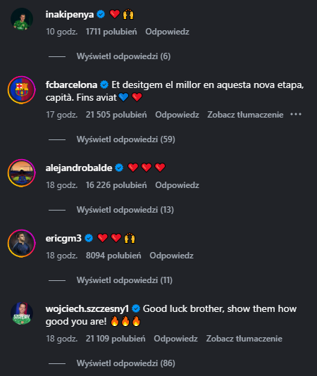 Wśród komentujących było wielu piłkarzy FC Barcelony, w tym Wojciech Szczęsny, który wysłał krótki komentarz. – Powodzenia bracie, pokaż im jaki jesteś dobry! – napisał polski bramkarz.