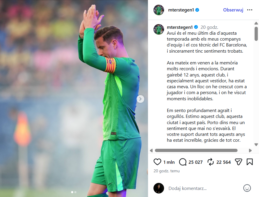 Ter Stegen opublikował na Instagramie pożegnalnego posta. – Moja podróż trwa w Katalonii i naprawdę nie mogę się doczekać tego, co mnie czeka. Życzę Wam wszystkiego najlepszego w dalszej części sezonu i mam nadzieję, że zdobędziecie jeszcze wiele trofeów – czytamy.