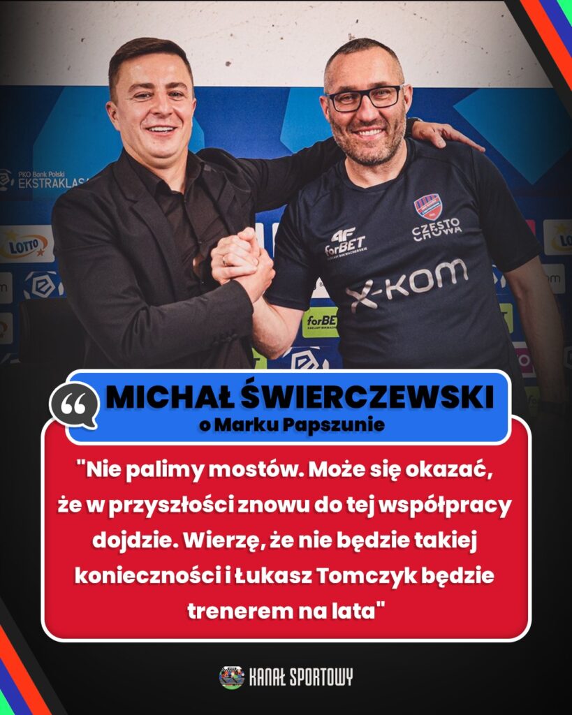 Łukasz Tomczyk został oficjalnie zaprezentowany jako nowy trener Rakowa Częstochowa, a więcej o jego wyboistej drodze do Ekstraklasy przeczytacie TU. Na poniedziałkowej konferencji prasowej głównie na pytania dziennikarzy odpowiadał Michał Świerczewski. Właściciel Rakowa w zabawny, ale i szczery sposób pożegnał Marka Papszuna.