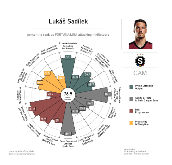 W sezonie 2022/23, jak pokazują zaawansowane statystyki, imponował przede wszystkim wygranymi pojedynkami w ofensywnie. Miał także bardzo dobre dośrodkowanie z głębi pola, jak i współczynnik spodziewanych asyst. Co ważne, Sadilek ma świetnie ułożoną stopę pod wykonywanie stałych fragmentów gry.