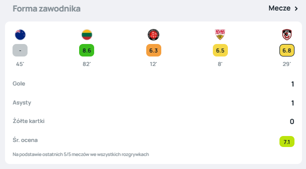 W bieżącym sezonie pomocnik reprezentacji Polski wystąpił w 17 spotkaniach we wszystkich rozgrywkach. Jego bilans to dwa gole i dwie asysty.