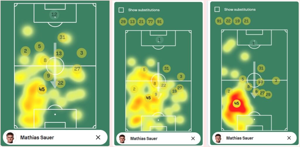 Dlatego, bo Mathias Sauer jest dosłownie typem piłkarza, który chce tak grać. W tym wypadku Gasparik nie będzie musiał uczyć 21-latka nowych zachowań, przestawiać go z gry jako tradycyjnego, szeroko ustawionego skrzydłowego na tego operującego w półprzestrzeniach. Sauer właśnie cechuje się ciągłymi zejściami do środka, tak by operować bliżej centrum i szukać sobie miejsca w pobliżu pola karnego rywali.