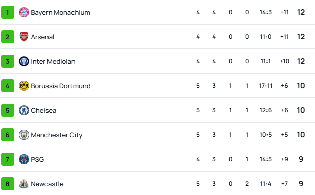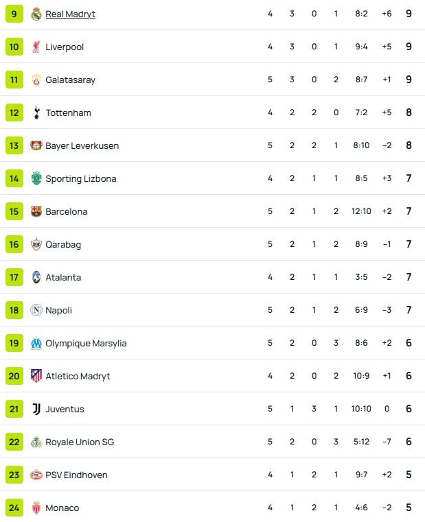 Po imponujących zwycięstwach do pierwszej ósemki weszła Borussia Dortmund (4. pozycja) oraz Chelsea (5.). Nie było jednak zmian na podium fazy ligowej – pierwsze trzy miejsca nadal zajmuje Bayern Monachium, Arsenal i Inter Mediolan. Można zatem powiedzieć, że szansy nie wykorzystał Manchester City, a więc ekipa, która znajduje się tuż za Chelsea i Borussią. Z kolei Barcelona zajmuje obecnie 15. miejsce. W jeszcze gorszej sytuacji jest m.in. Atletico Madryt (20.) i Juventus (21.).