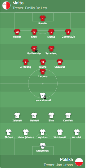 Skład Polaków: Bartłomiej Drągowski – Przemysław Wiśniewski, Tomasz Kędziora, Jakub Kiwior – Paweł Wszołek, Bartosz Slisz, Piotr Zieliński, Michał Skóraś – Jakub Kamiński, Nicola Zalewski – Robert Lewandowski.