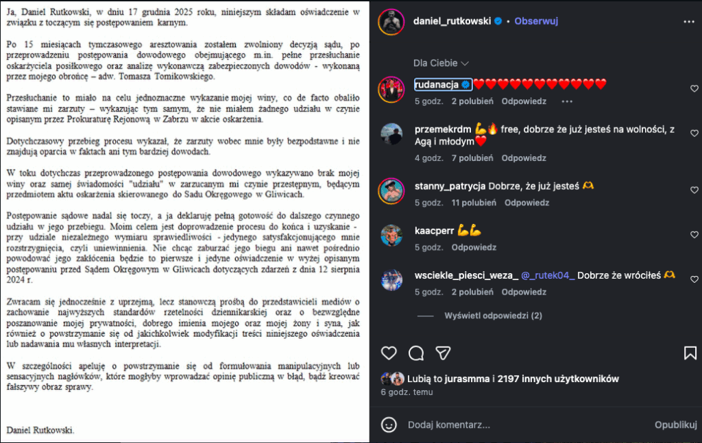 Przypomnijmy: w sierpniu 2024 roku doszło do zatrzymania Daniela Rutkowskiego przez nieumundurowanych funkcjonariuszy policji. Zawodnik KSW został zatrzymany w domu, gdzie przebywał z żoną oraz małoletnim dzieckiem. Sportowiec, jak i jego najbliżsi, byli całą sytuacją zszokowani. Jak pisał wówczas dziennik „Fakt”, prokuratura miała zarzucać „Rutkowi” napaść z użyciem niebezpiecznych narzędzi. Po 15 miesiącach zawodnik MMA został zwolniony z tymczasowego aresztu i wystosował oświadczenie.