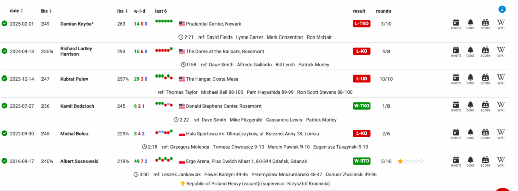Jeszcze kilka ładnych lat temu Andrzej Wawrzyk był obiecującym zawodnikiem wagi ciężkiej. Obecnie trudno w to uwierzyć, ale w 2017 roku miał walczyć o mistrzostwo świata z Deontayem Wilderem. Ostatecznie nie dostąpił tego zaszczytu, bo w jego organizmie wykryto doping, a konkretnie stanozolol. Na ring wrócił dopiero w 2022 roku. I choć widać było rdzę w jego boksie, to Wawrzyk regularnie się bił. Z ostatnich pięciu walk przegrał jednak cztery.